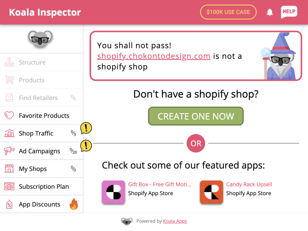 ちなみにShopifyサイトではないサイトに対してCoala Inspectorを使用した場合は次のようにちゃんと「Shopifyサイトではありません。」と表示してくれるので分かりやすいですね。